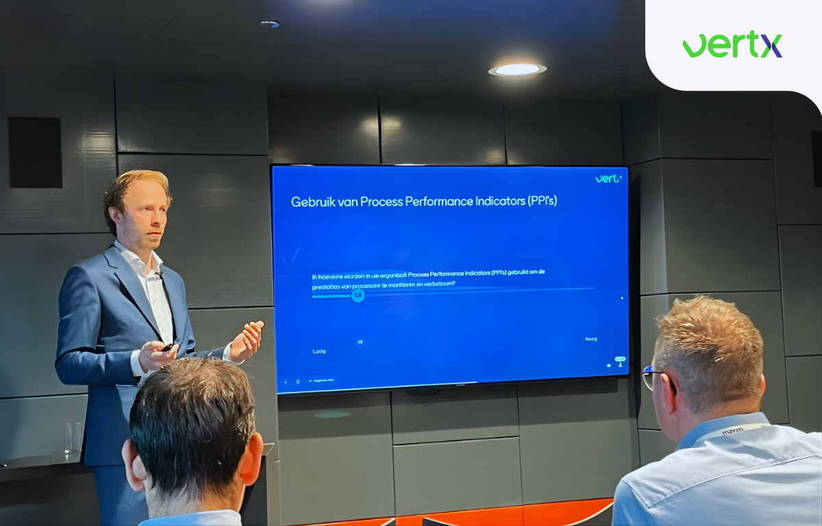 Tijdens de sessie gingen deelnemers zelf aan de slag met onderdelen van de Business Process Maturity Scan van VertX. Deze scan geeft inzicht in de volwassenheid van BPM en maakt duidelijk waar de grootste verbeterkansen liggen. Op basis van 15 kritische variabelen laat de scan zien waar je als organisatie staat en wat nodig is om door te groeien.